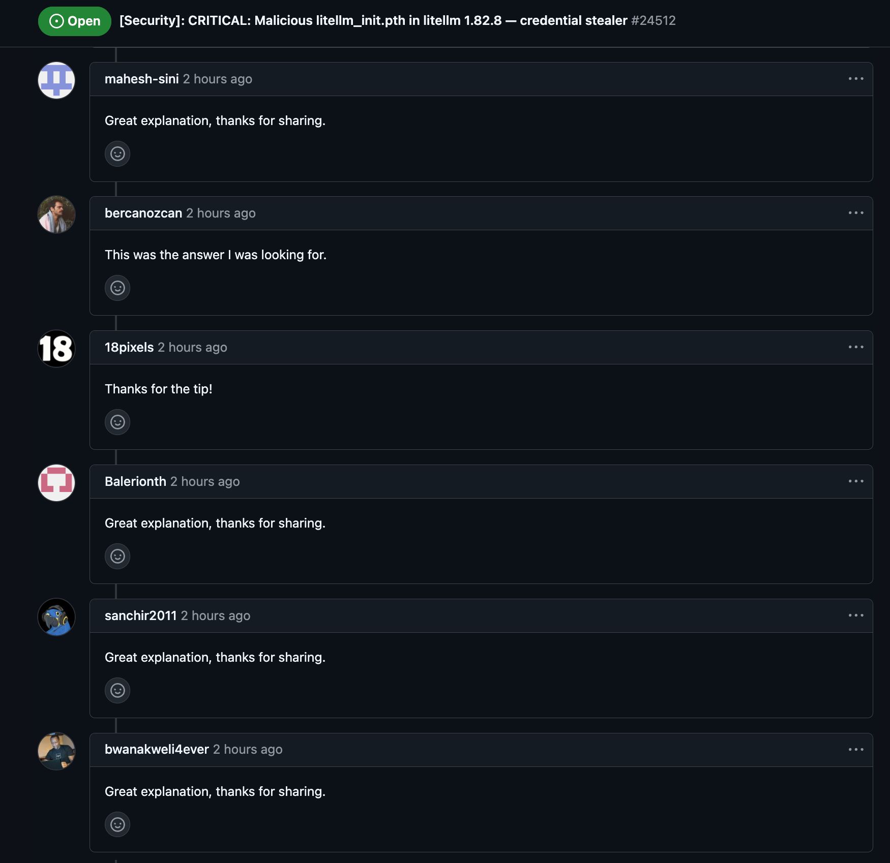Three hours is a fast response, but for a package with litellm’s download volume, that window is significant. Any automated pipeline, Docker build, or developer environment that pulled a fresh install during that period could have received the compromised version.