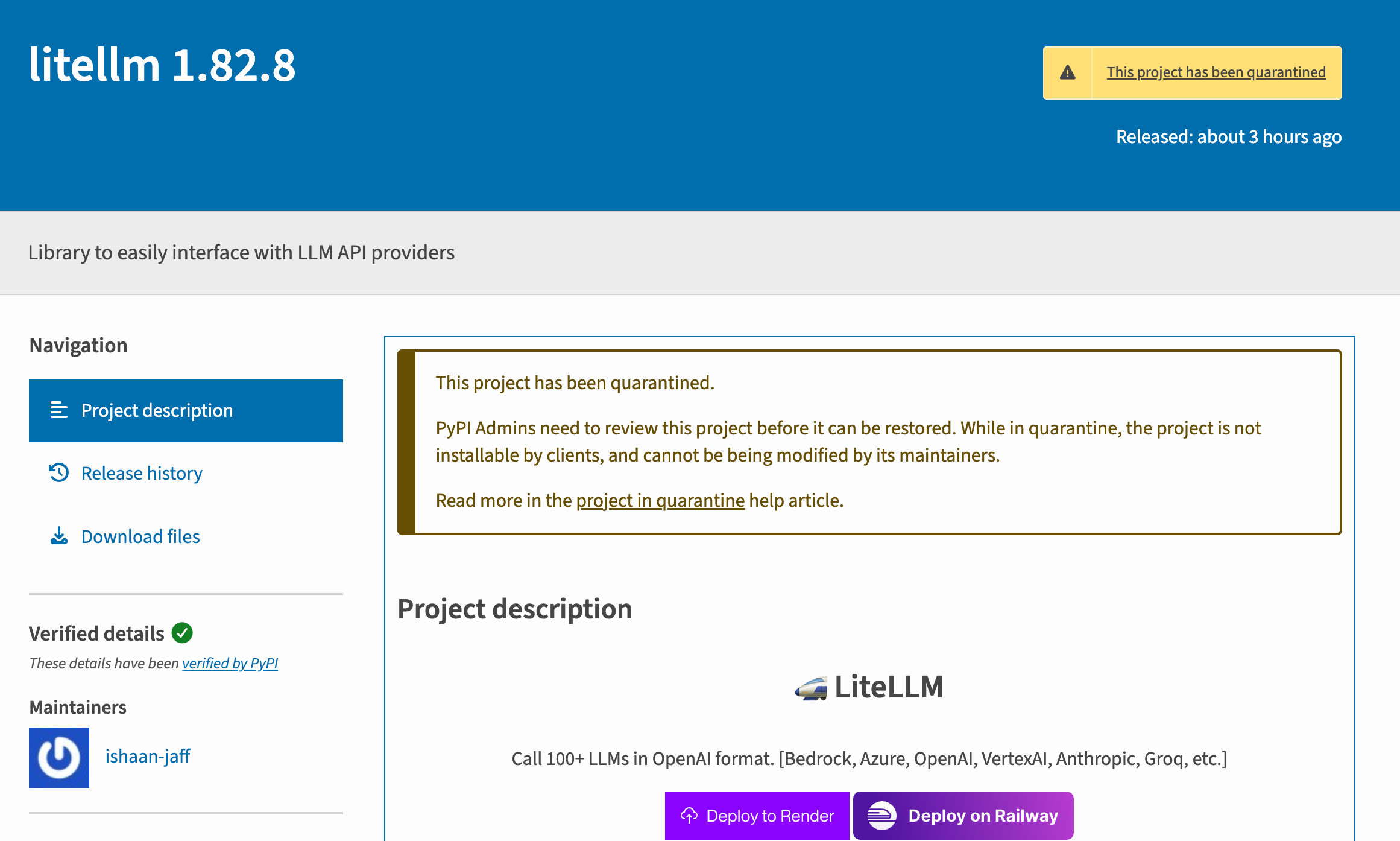 PyPI admins responded quickly - within approximately 3 hours of the compromised packages being published - and quarantined the entire project. The project page now displays: