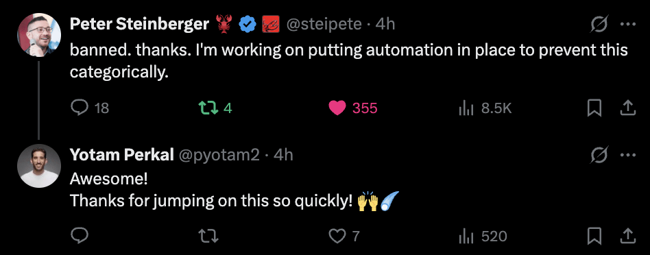 The malicious packages was were quickly removed from ClawHub by Peter Steinberger and the users behind it were banned.