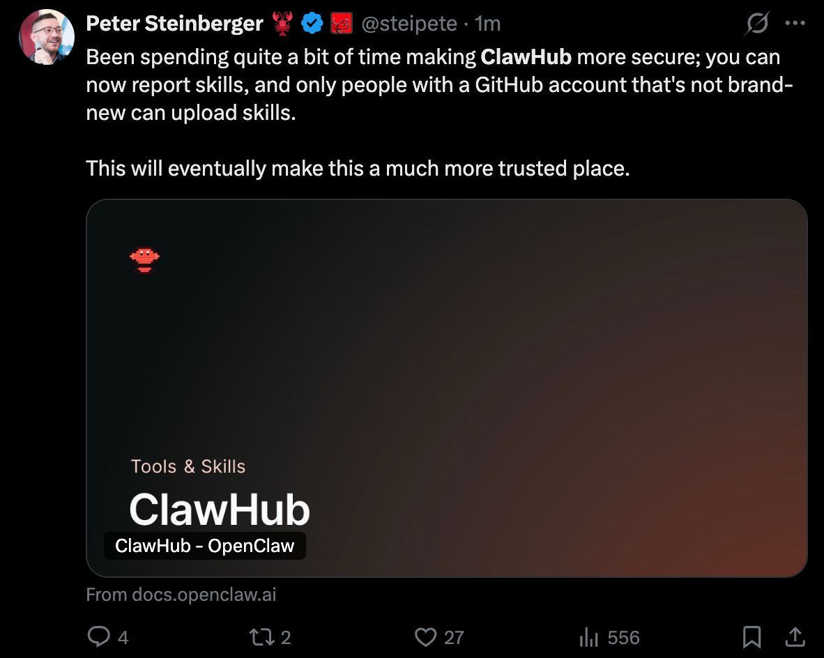 Over time, the skill ecosystem and related marketplaces will mature and become more secure. We’re already seeing early steps in that direction - for example, ClawHub recently added GitHub user verification (including a minimum account age), along with reporting and moderation capabilities: